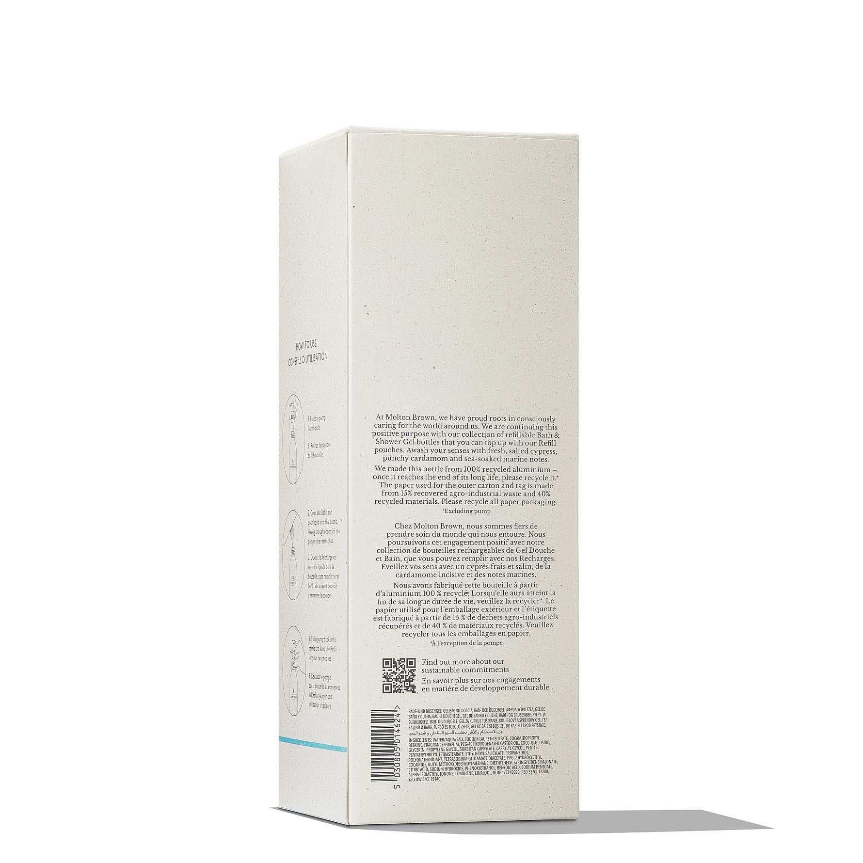 Molton Brown Infinite Bottle Coastal Cypress & Sea Fennel Bath & Shower Gel on ihanan aromaattinen suihkusaippua vastuullisessa uudelleentäytettävässä pullossa, joka on valmistettu 100 % kierrätetystä alumiinista. Australialaisen merifenkolin ja suolaisen sypressin merellisiä nuotteja sisältävä virkistävä suihkusaippua antaa kylpy- ja suihkurituaalillesi ripauksen ylellisyyttä ja tuo mieleen raikkaan merituulen. Puhdistaa ihoa ja antaa sille ihanan tuoksun. Käytä yhdessä yhteensopivan Molton Brown -vartaloemulsion kanssa viimeistelläksesi tuoksuelämyksen.