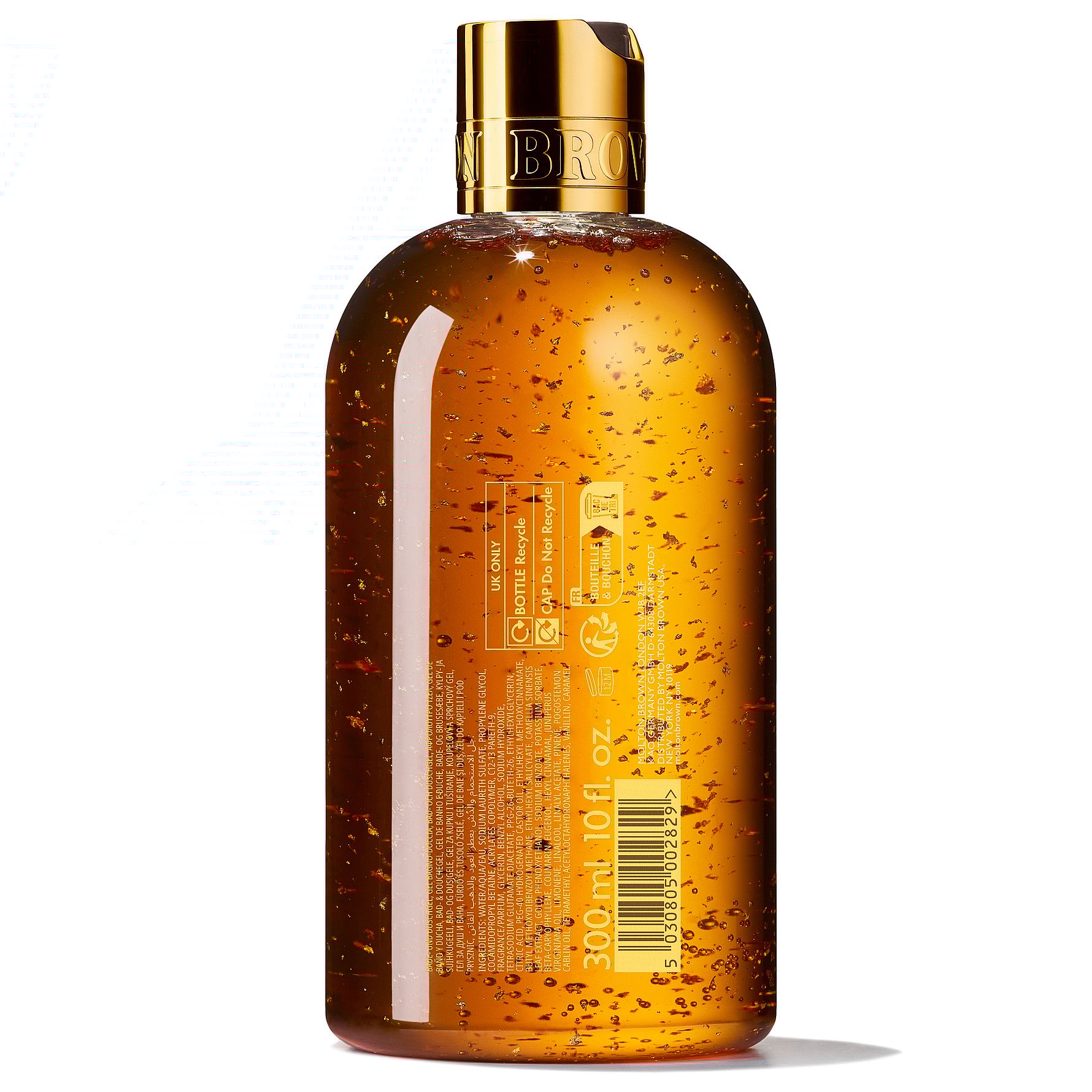 Molton Brown Mesmerising Oudh Accord & Gold Bath & Shower Gel antaa kylpy- ja suihkurituaalillesi ripauksen ylellisyyttä. Sisältää raikkaan bergamotin, savuisen mustan teen ja hunajaisen hartsin nuotteja. 23,5 karaatin kultahiukkasia sisältävä ylellinen suihkugeeli puhdistaa ihon ja antaa sille ihanan tuoksun. Käytä yhdessä yhteensopivan Molton Brown -vartaloemulsion kanssa viimeistelläksesi tuoksuelämyksen.