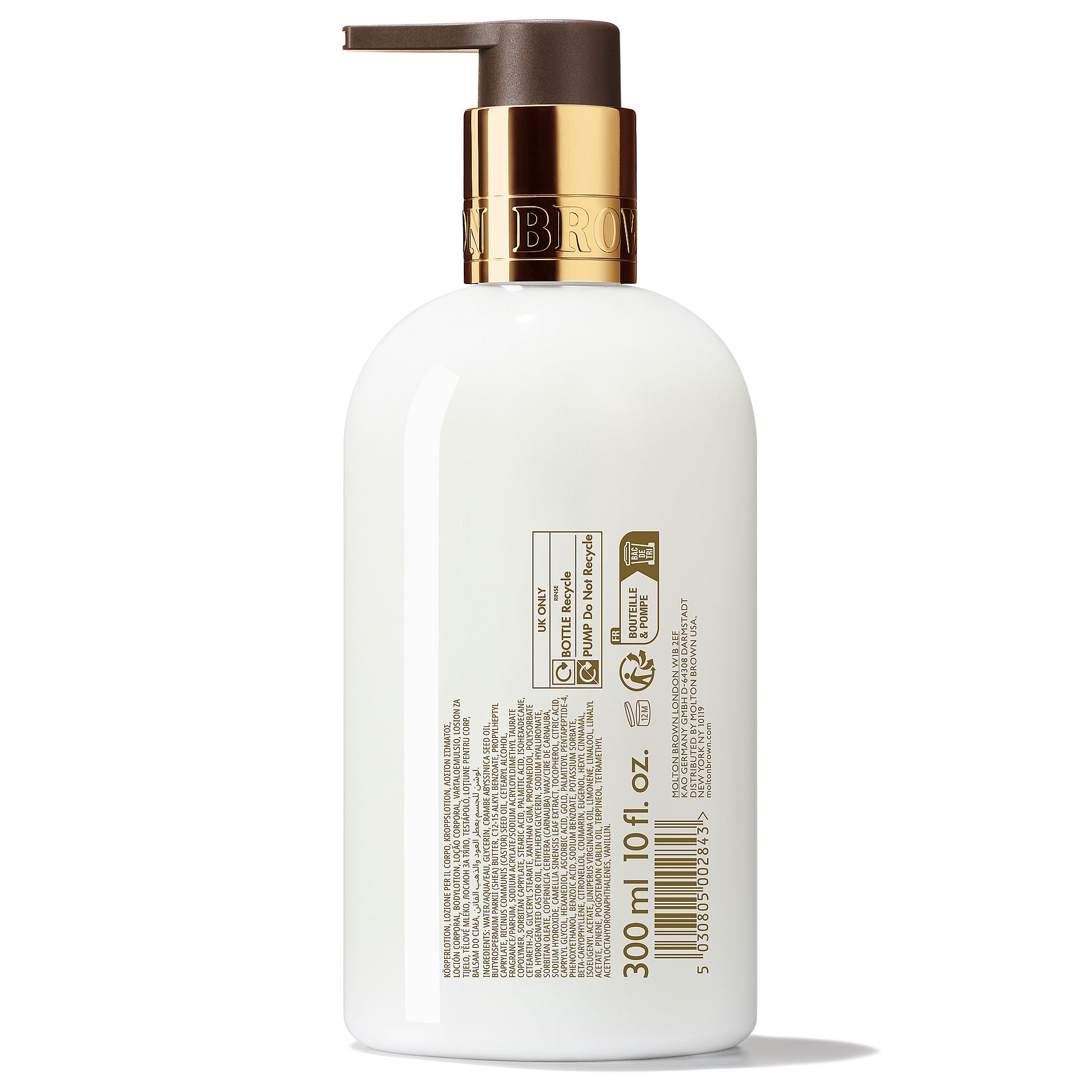 Molton Brown Mesmerising Oudh Accord & Gold Body Lotion kosteuttava ja ravitseva vartaloemulsio sisältää raikkaan bergamotin, savuisen mustan teen ja hunajaisen hartsin täyteläisiä nuotteja. Nopeasti imeytyvät öljyt tekevät ihosta silkinpehmeän ilman tahmaista tunnetta – täydellisen ylellinen tunne suihkun jälkeen. Käytä yhdessä yhteensopivan Molton Brown -suihkugeelin kanssa vahvistaaksesi täyteläistä, lämmintä tuoksua.