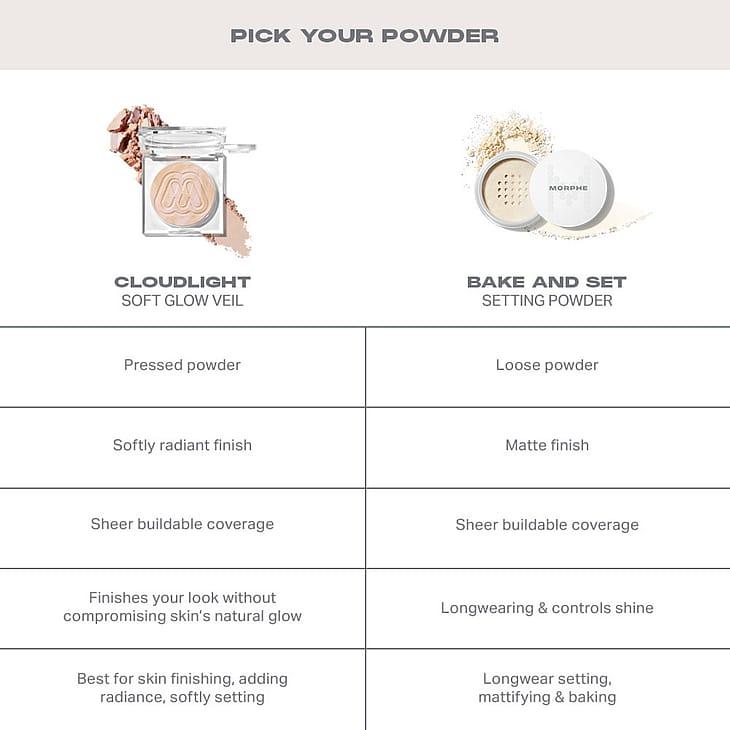 Morphen Bake & Set -kiinnityspuuterin avulla kiinnität meikin jopa 16 tunnin ajaksi ja minimoit kiiltoa jopa 24 tuntia. Tämä talkiton, kevyt, hienojakoinen, silkkisen irtonainen puuteri levittyy huomaamattomaksi, pehmeäksi ja luonnolliseksi viimeistelyksi ja tasoittaa samalla huokosia ja juonteita. Saatavana kolmessa koossa matkoille tai jokapäiväiseen käytt öön – ja monissa sävyissä, joilla on läpikuultavia, kirkastavia ja väriä korjaavia vaikutuksia.