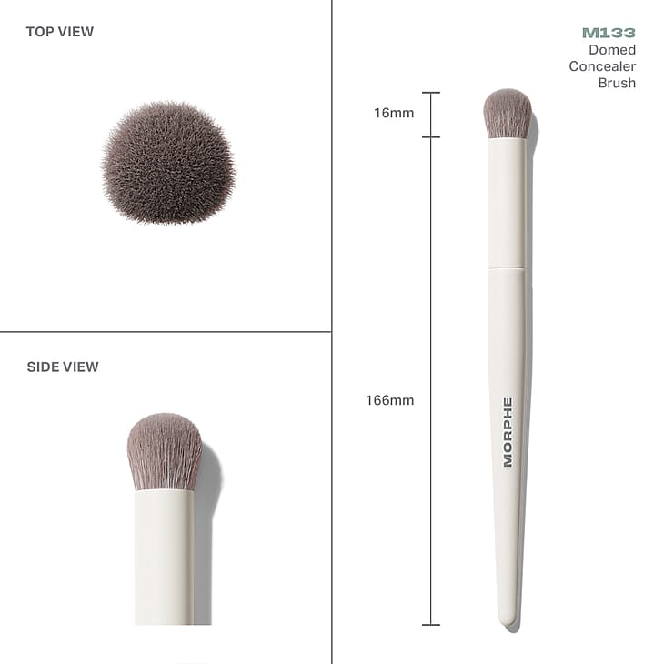 Morphe M133 Domed Concealer Brush -sivellin hyödyntää M104-meikkivoidesiveltimen ominaisuuksia minikoossa, jotta peitevoiteen levittäminen ja kerrostaminen onnistuu vaivatta. Tuuhean pehmeä pinta leviää koskettaessaan ihoa, jotta tuote leviää iholle vaivattomasti. Pyöristettyjen reunojen ansiosta häivyttäminen myös vaikeasti saavutettavissa olevilla alueilla sujuu saumatta.