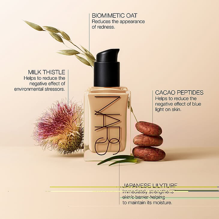Skin in its best light. NARS Light Reflecting Foundation on innovatiivinen meikin ja ihonhoidon hybridi, jossa yhdistyvät keskitasoinen, kerrostettava peittävyys ja luonnollisen säteilevä lopputulos. Meikkivoide tasoittaa välittömästi ihon sävyä ja rakennetta, peittää epäpuhtaudet, tummat läiskät ja punoituksen – ja saa ihon näyttämään tasaisemmalta jo ensimmäisellä levityksellä (+93 %*). Kuuden viikon päivittäisen käytön jälkeen ihon kirkkaus paranee, jopa silloin kun meikki on poistettu**. Koostumus sisältää 70 % ihoa hoitavia ainesosia, jotka vahvistavat ihon suojamuuria ja suojaavat sitä ympäristön haittavaikutuksilta ja sinivalolta. Sopii kaikille ihotyypeille, myös herkälle iholle.
