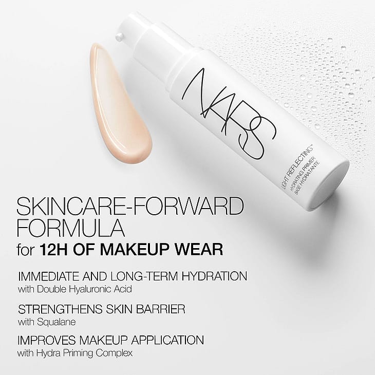 LIGHT REFLECTING by NARS kosteuttavan pohjustusvoiteen virkistävä, kevyt koostumus antaa luonnollisen hehkun ja sileän saumattoman meikkipohjan 12 tunniksi. Juonteita silottavan pohjustusvoiteen innovatiivinen meikin ja ihonhoidon hybridikoostumus sisältää 93 % ihonhoitoainesosia, jotka kohentavat ihon rakennetta, tekevät juonteista vähemmän näkyviä ja kirkastavat ihoa ajan myötä.