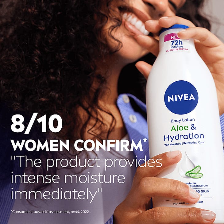 NIVEA Aloe & Hydration Body Lotion -vartaloemulsio tekee ihosta terveen näköisen ja syväkosteuttaa sitä 72 tuntia. Erittäin kevyt ja virkistävä koostumus, tekee ihosta huomattavan pehmeän ja sileän.