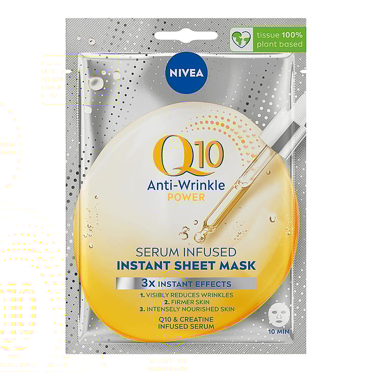 NIVEA Q10 Anti-wrinkle Power Serum Infused Sheet Mask -kasvonaamio tarjoaa 3x välittömän vaikutuksen: 1. Vähentää ryppyjä näkyvästi. 2. Kiinteyttää. 3. Ravitsee ihoa. Sisältää puoli pulloa seerumia*, jossa yhdistyvät tehokas, puhdas Q10-koentsyymi ja energiaa antava kreatiini. Kangasnaamio tekee ihosta ihanan sileän ja kiinteämmän. Naamio antaa ihollesi tehokasta anti-age-hoitoa tasoittaen ryppyjä ja pieniä juonteita. Tekee ihostasi raikkaan ja hyvinvoivan näköisen. Biohajoava kangasnaamio.