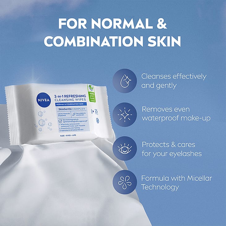 Alkoholittomat NIVEA VISAGE REFRESHING CLEANSING WIPES -puhdistuspyyhkeet sisältävät lootusuutetta ja vitamiineja. Ne puhdistavat kasvosi, kaulasi ja silmäsi hellävaraisesti ja miellyttävästi ja ylläpitävät samalla ihon luonnollista kosteustasapainoa. Pehmeä pinta ja virkistävä koostumus raikastavat ihon. NIVEA Laboratories on kehittänyt NIVEA VISAGE Refreshing Cleansing Wipes -puhdistuspyyhkeet erityisesti normaalin ja sekaihon puhdistustarpeisiin.