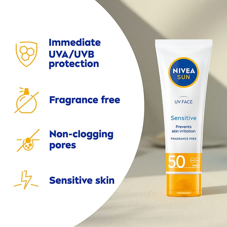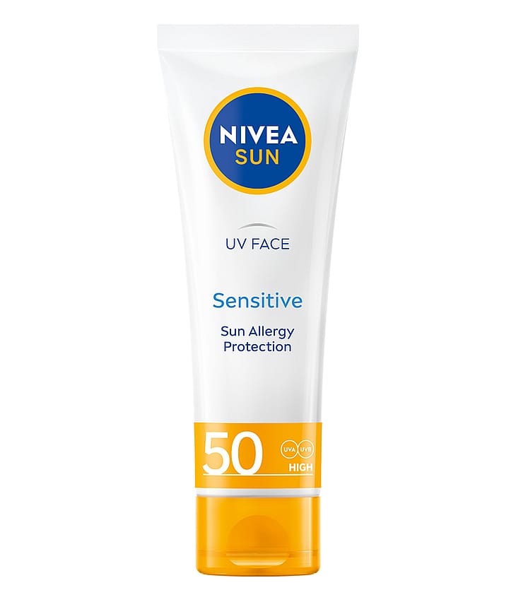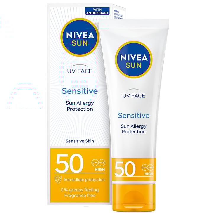 NIVEA SUN UV Face Sensitive SK50 -aurinkosuojavoide on erityisesti kasvoille kehitetty korkean ja tehokkaan suojan sisältävä aurinkosuojavoide. Suojaa kasvojen ihoa auringolta ja sen aiheuttamalta ennenaikaiselta vanhenemiselta. Aurinkovoide suojaa ihoa myös sisältäpäin Licochalcone A:n ansiosta. Tämä voimakas luonnollinen antioksidantti aktivoi ihon omaa puolustusmekanismia. Kevyt koostumus imeytyy nopeasti. Kehitetty erityisesti herkälle iholle. Sisältää myös sinivalosuojan. Kevyt koostumus, ei jätä tahmaista tunnetta iholle. Hajusteeton.