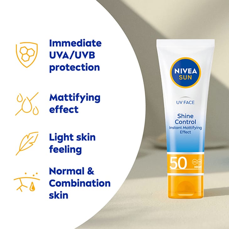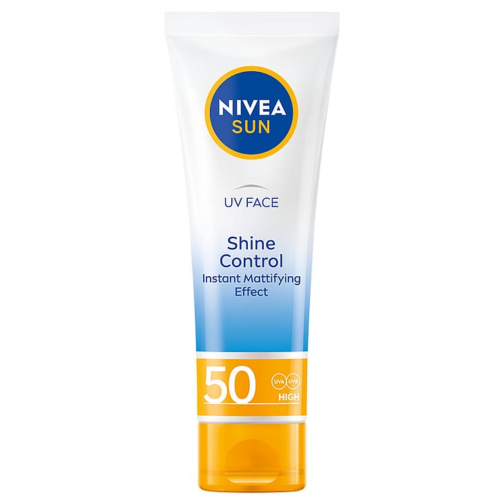 NIVEA SUN UV Face Shine Control Cream SK 50 -aurinkosuojavoide on erityisesti kasvoille kehitetty korkean ja tehokkaan suojan sisältävä aurinkosuojavoide. Se suojaa ihoa ulkoapäin UVA/UVB-säteiltä ja sinivalolta, jotka aiheuttavat ihovaurioita ja ihon ennenaikaista vanhenemista. Aurinkovoide suojaa ihoa myös sisältäpäin lakritsiuutteen ansiosta. Tämä voimakas luonnollinen antioksidantti aktivoi ihon omaa puolustusmekanismia. Voide antaa välittömän suojan UVA- ja UVB-säteilytä vastaan ja suojaa kasvojen ihoa auringolta vähentäen samalla ihon pinnan ylimääräistä öljyä ja hilliten ihon kiiltoa. Tekee ihosta ihanan mattapintaisen ja sopii hyvin meikin alle. Suojakerroin 50.