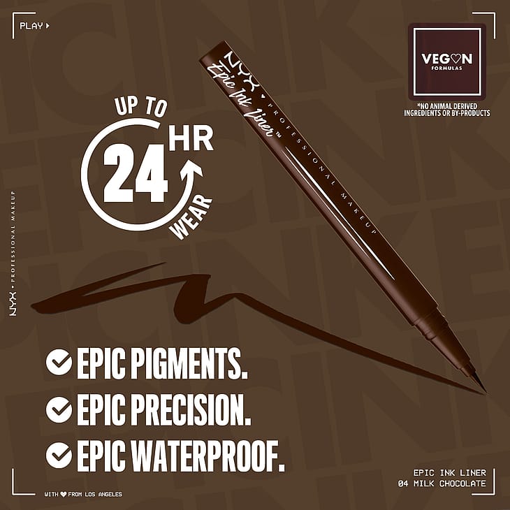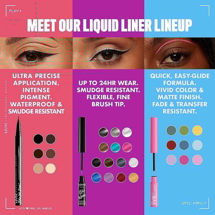 NYX Professional Makeup nestemäinen, vedenkestävä silmänrajauskynä sivellinkärjellä tekee erittäin tarkkojen rajausten tekemisestä todella helppoa. Vain yhdellä vedolla teet vaivattomasti runsaspigmenttisen ja pitkäkestoisen rajauksen. Ohuella, joustavalla sivellinkärjellä piirrät helposti sekä hillittyjä että voimakkaampia rajauksia. Halusitpa hillityn rajauksen tai klassiset kissansilmät, vedenkestävällä, nestemäisellä silmänrajauskynällä upeiden meikkien tekeminen onnistuu. Saatavana useissa runsaspigmenttisissä sävyissä.