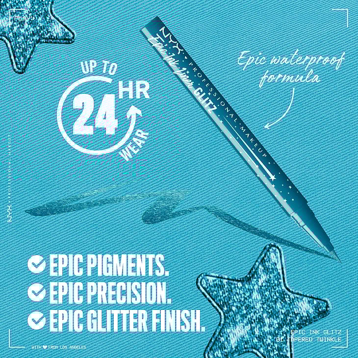 NYX Professional Makeup Epic Ink Liquid Eyeliner Glitz Metallic nestemäinen silmänrajauskynä antaa eeppistä kimalletta. Erittäin kapea siveltimen kärki antaa intensiivistä väriä ja kimalteisen metallisen lopputuloksen vain yhdellä vedolla. Veden- ja hienkestävä koostumus ei varise ja kestää jopa 24 tuntia. Saatavana 6 denim-vaikutteisessa sävyssä.