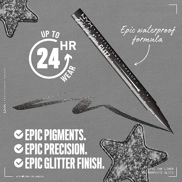 NYX Professional Makeup Epic Ink Liquid Eyeliner Glitz Metallic nestemäinen silmänrajauskynä antaa eeppistä kimalletta. Erittäin kapea siveltimen kärki antaa intensiivistä väriä ja kimalteisen metallisen lopputuloksen vain yhdellä vedolla. Veden- ja hienkestävä koostumus ei varise ja kestää jopa 24 tuntia. Saatavana 6 denim-vaikutteisessa sävyssä.