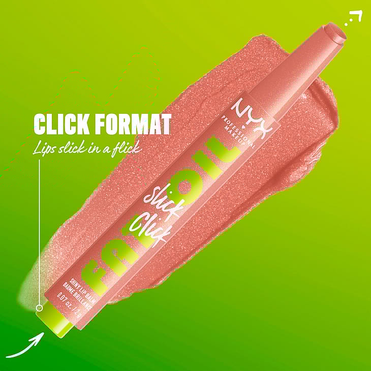 NYX Professional Makeup Fat Oil Slick Click sävyttävä huulivoide antaa juuri oikean määrän tuotetta yhdellä klikkauksella. Vegaaninen avokado-, lakka- ja vadelmaöljyä sisältävä koostumus* hoitaa huuliasi tehokkaasti.