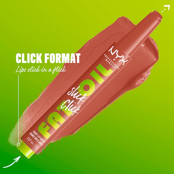 NYX Professional Makeup Fat Oil Slick Click sävyttävä huulivoide antaa juuri oikean määrän tuotetta yhdellä klikkauksella. Vegaaninen avokado-, lakka- ja vadelmaöljyä sisältävä koostumus* hoitaa huuliasi tehokkaasti.