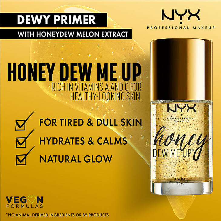 NYX Professional Makeup Honeydew Me Up Primer nestemäisen meikinpohjustustuotteen koostumus sisältää hunajameloniuuttetta. Vegaaninen meikinpohjustustuote luo kauniin pohjan kasteenraikkaalle meikille ja pidentää samalla meikin kestoa.Tuote imeytyy nopeasti ja jättää ihon silkinpehmeäksi. Se sisältää pieniä kultahiukkasia, jotka heijastavat valoa ja antavat iholle säteilevää hehkua. Luo täydellinen pohja meikkivoiteelle tai käytä sitä sellaisenaan antamaan hehkuva lopputulos. Vegaaninen koostumus*.