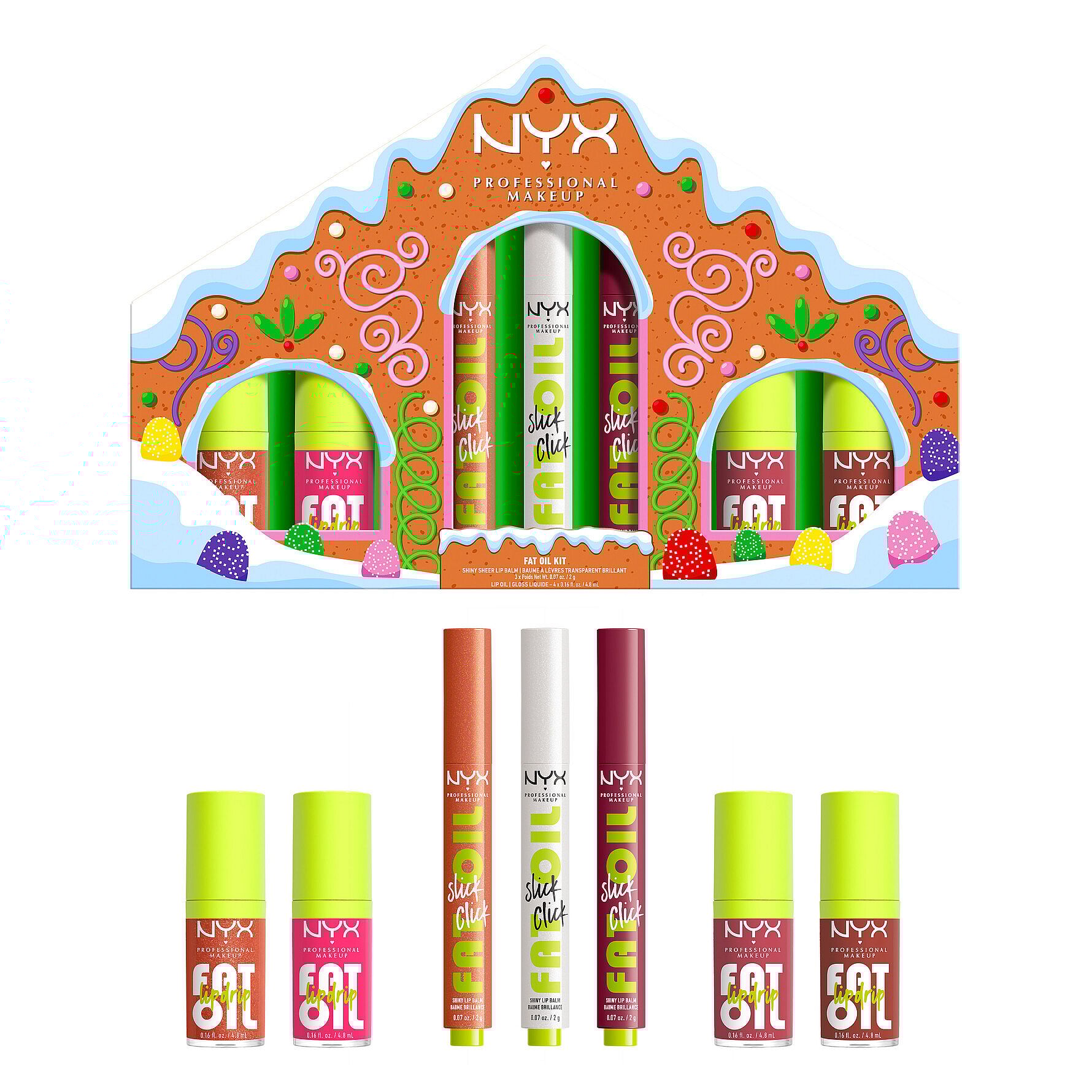 Sulostuta joulun odotusta NYX Professional Makeup -piparkakkutalopakkauksella. Rajoitetun ajan saatavan oleva pakkaus sisältää Fat Oil Lip Drip -huulikiillon ja Fat Oil Slick Click -huulivoiteen. Juuri sopiva kauden viihtyisään tunnelmaan! Koostumukset sisältävät ravitsevia vadelman- ja lakansiemenöljyjä sekä skvalaania. Helposti levitettävät koostumukset antavat kosteutusta jopa 12 tuntia sekä kiiltävän ja tahmaamattoman lopputuloksen. Piparkakkutaloa muistuttava pakkaus tuo juhlavaa tunnelmaa.