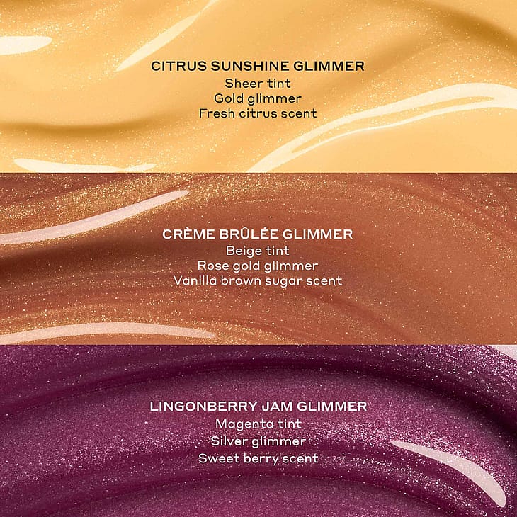 -Citrus Sunshine Glimmer: In Läpikuultava sävy, jossa on kullanväristä kimmellystä + raikas sitruksen tuoksu.