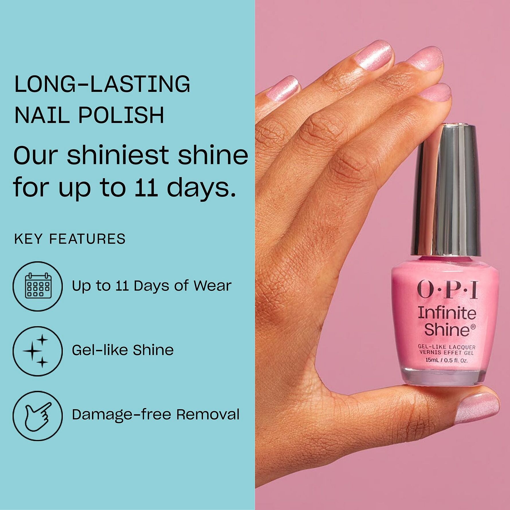 Locks like gel, unlocks like lacquer. OPI esittelee uuden mullistavan Infinite Shine -koostumuksen, jonka teknologia antaa kiiltoa, peittävyyttä ja pitkäaikaista kestoa jopa 11 päiväksi. Geelimäinen koostumus antaa sileän ja tasaisen peittävyyden ilman raitoja tai kuplia. Helppo poistaa asetonilla nopeasti ja vahingoittamatta kynttä. Niin hyvä, että sen luulisi olevan geelilakka. Infinite Shine yhdistää kaiken, mitä rakastat geeli- ja kynsilakassa.