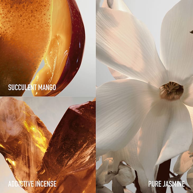 Avantgardistisen ylellisyyden ydin, täynnä upeita ainesosia. Vastustamaton tuoksu, joka huokuu rohkeaa sensuaalisuutta, jossa mehukas mango, poikkeuksellisen puhdas jasmiini ja koukuttava, kermaisen pehmeä suitsuke sulautuvat yhteen. Tuoksu on valmistettu Grassen alueella Ranskassa, ja 90 % sen ainesosista on luonnollista alkuperää.