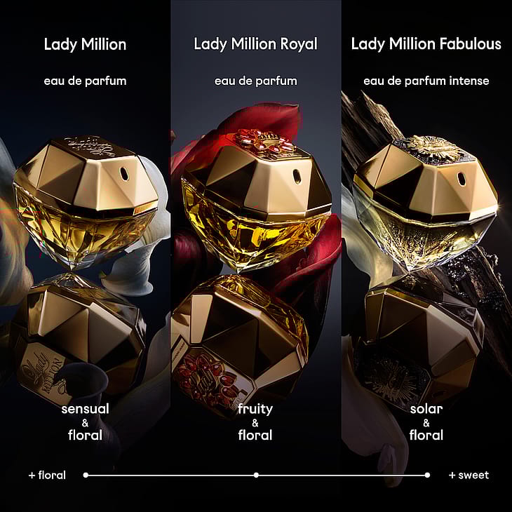 Koe Lady Million Fabulous - kukkainen, tyylikäs ja hienostunut Eau de Parfum Intense Paco Rabannelta. Nauti ylellisen tuberoosan, jasmiinin ja ylang-ylangin viettelevästä tuoksusta, joka tanssii yhdessä loistavan ja seksikkään vaniljan kanssa. Sensuellit tonkapavut ja tyylikäs sammal luovat sensuellia ja houkuttelevaa lämpöä. Lady Million Fabulous on ylistys elämän mahtihetkille - hän on yön kuningatar ja juhlien ikuinen keskipiste. Säihkyvä, timantinmuotoinen pullo tekee tuoksusta täydellisen, kun illan pukeutumisella halutaan tehdä vaikutus. Tämä intensiivinen Eau de Parfum kutsuu sinut hypnoottiseen ja energiseen tunnelmaan tanssilattialla - on sinun vuorosi loistaa. Ylänuotit: mandariini, roseepippuri ja bergamotti, Sydännuotit: Tuberoosa, jasmiini ja ylang-ylang. Pohjanuotit: vanilja, tonkapapu ja sammal TUOTETIEDOT: - Parfum Intensea voidaan käyttää päivittäin - sisältää 20-40 % tuoksutiivistettä - Jättää korostetun tuoksujäljen, joka kestää jopa 12 tuntia