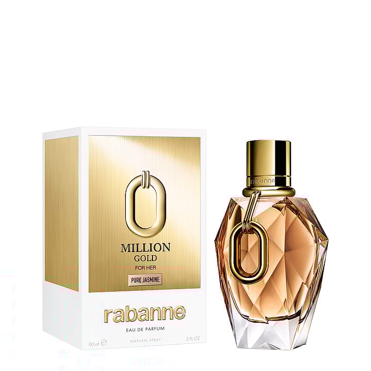Million Gold for Her Pure Jasmine muuttaa Rabannen ensimmäisen Grand Floral -tuoksun todelliseksi kultakaivokseksi. Rajoitettu painos kohottaa alkuperäistä tuoksua kultaisella annoksella Coeur de Saison -jasmiinia, aurinkoista ylang-ylangia ja säteilevää, raikasta mandariinia. Arvokkaiden, kultaisten ainesosien kolmikko, jota korostaa aistillinen vaniljauute ja kontrastoi mineraalinen myski.