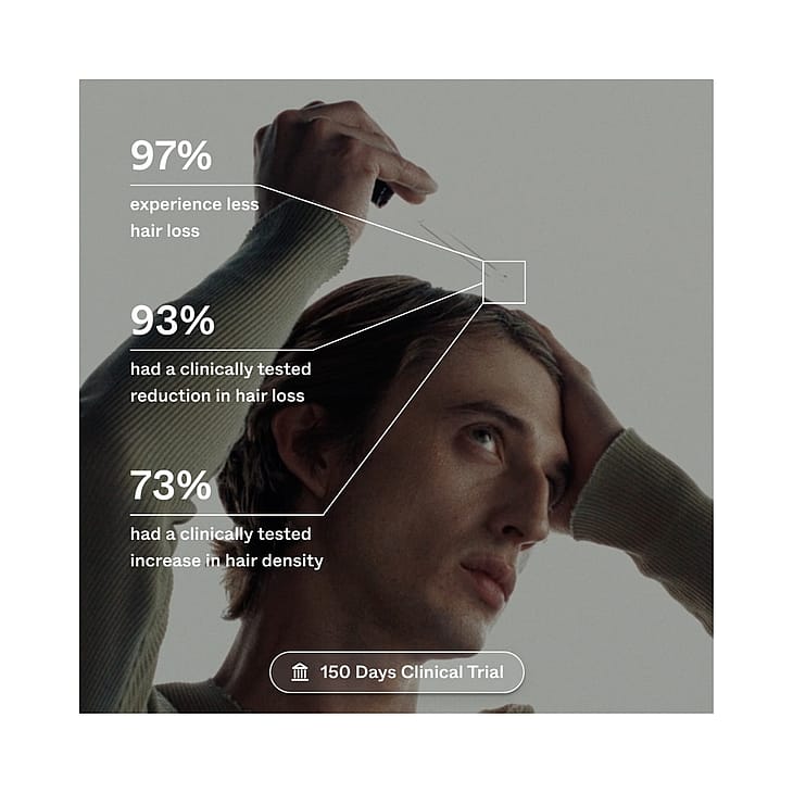• Kliinisesti tutkittu ja testattu. Tutkimusaika 150 päivää, jonka jälkeen 93 %:lla tutkituista hiustenlähtö väheni ja 73 % tutkituista huomasi hiusten vahvistuneen