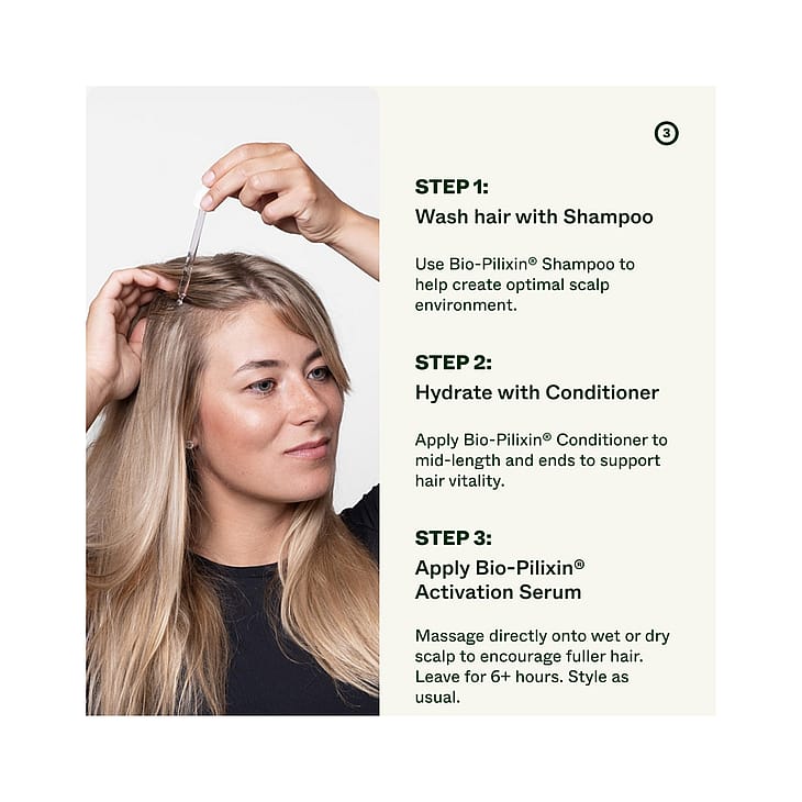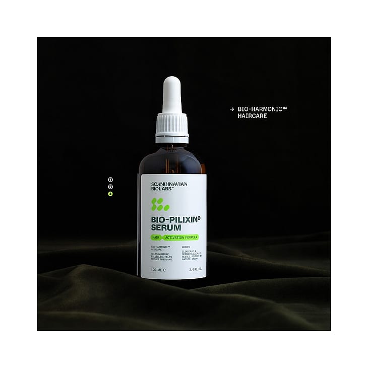 Hiuspohjan seerumi ennenaikaiseen hiustenlähtöön ja kaljuuntumiseen naisille. Scandinavian Biolabs Bio-Pilixin® Activation Serum+ For Women auttaa vähentämään hiustenlähtöä ja tukemaan uusien hiusten kasvua. Hiuspohjaan levitettävä seerumi sisältää tarkkaan valittuja hiusten kasvua edistäviä ja karvatuppea hoitavia luonnollisia kasvutekijöitä. Tutkimuksessa 93 %:lla tutkituista hiustenlähtö väheni 150 päivän jälkeen ja 73 % huomasi hiusten vahvistuneen. Dermatologisesti ja kliinisesti testattu. Kehitetty ja valmistettu Tanskassa.