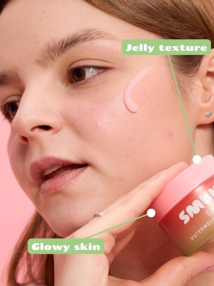 Smuuti Skin Watermelon Jelly Cream on hyaluronihappoa ja vesimeloniuutetta sisältävä voide, joka tekee ihosta täyteläisen ja kuulaan. Kevyt koostumus on kevyen geelin ja ravitsevan voiteen välimuoto. Se imeytyy nopeasti jättäen ihon heleäksi ja kosteutuksi.Hyaluronihappo (hyaluronic acid) on yksi tehokkaimmista ainesosista ihon kosteutukseen. Hyaluronihapolla on kyky sitoa kosteutta itseensä jopa 10 kertaa oman painonsa verran. Hyaluronihappo tekee ihosta kosteutetun, sileän ja täyteläisen. Ihon kosteuttamisesta hyötyvät kaikki ihotyypit, rasvoittuvasta ihosta herkkään ihoon. Vesimeloni on herkullinen, kesäinen hedelmä täynnä vitamiineja, antioksidantteja – ja tietenkin runsaasti vettä. Vesimeloniuute sisältää paljon iholle hyödyllisiä vitamiineja (A, B ja C) sekä aminohappoja, jotka kosteuttavat, heleyttävät ja rauhoittavat ihoa. Kiitos vesimelonin korkean vesipitoisuuden, se on erittäin kosteuttava ainesosa, joka auttaa myös tasoittamaan hienoja juonteita. Voide sopii täydellisesti meikin alle, sillä se jättää kauniin, tasaisen lopputuloksen eikä rullaudu. Rullautumisen välttämiseksi suosittelemme antamaan voiteen imeytyä kunnolla ennen meikkiä. Voide sisältää myös kosteuttavaa glyseriiniä. Ei sisällä eläinperäisiä ainesosia. Sopii kaikille ihotyypeille.