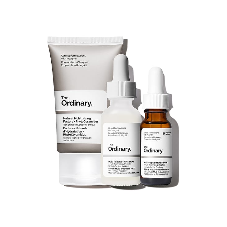 Levitä puhdistetulle iholle muutama tippa Multi-Peptide + HA Serumia ja hiero ihoon. Levitä sitten pieni määrä Multi-Peptide Eye Serumia silmänympärysalueelle. Viimeistele levittämällä pieni määrä Natural Moisturizing Factors + PhytoCeramides -kosteusvoidetta.
