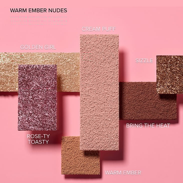 Warm Ember Nudes Palette: Shades Warm Ember, Cream Puff, Bring The Heat: MICA ZINC STEARATE TRIMETHYLSILOXYSILICATE CAPRYLYL METHICONE LAUROYL LYSINE TRIMETHYLSILOXYPHENYL DIMETHICONE DIMETHICONE DIMETHICONOL CAPRYLYL GLYCOL SODIUM HYALURONATE GLYCERIN RHODODENDRON FERRUGINEUM EXTRACT COCOS NUCIFERA (COCONUT) FRUIT JUICE METHYLPROPANEDIOL PHENYLPROPANOL WATER\AQUA\EAU SILICA TRIETHOXYCAPRYLYLSILANE MALTODEXTRIN FRAGRANCE (PARFUM) COCOS NUCIFERA (COCONUT) LIQUID ENDOSPERM POTASSIUM SORBATE SODIUM BENZOATE +/- TITANIUM DIOXIDE (CI 77891) IRON OXIDES (CI 77491) IRON OXIDES (CI 77492) IRON OXIDES (CI 77499) CARMINE (CI 75470) ULTRAMARINES (CI 77007) Shades Sizzle, Rose-ty Toasty: CALCIUM SODIUM BOROSILICATE MICA OCTYLDODECYL STEAROYL STEARATE DIISOSTEARYL MALATE POLYBUTENE SYNTHETIC FLUORPHLOGOPITE ZINC STEARATE HYDROGENATED POLYCYCLOPENTADIENE C10-18 TRIGLYCERIDES CAPRYLIC/CAPRIC TRIGLYCERIDE CAPRYLYL GLYCOL SODIUM HYALURONATE GLYCERIN RHODODENDRON FERRUGINEUM EXTRACT COCOS NUCIFERA (COCONUT) FRUIT JUICE WATER\AQUA\EAU HEXYLENE GLYCOL COPERNICIA CERIFERA (CARNAUBA) WAX\ COPERNICIA CERIFERA CERA \CIRE DE CARNAUBA TIN OXIDE POLYETHYLENE FRAGRANCE (PARFUM) COCOS NUCIFERA (COCONUT) LIQUID ENDOSPERM TOCOPHEROL PHENOXYETHANOL SODIUM DEHYDROACETATE POTASSIUM SORBATE SODIUM BENZOATE +/- TITANIUM DIOXIDE (CI 77891) IRON OXIDES (CI 77491) IRON OXIDES (CI 77499) CARMINE (CI 75470) YELLOW 5 LAKE (CI 19140) Shade Golden Girl: CALCIUM SODIUM BOROSILICATE SYNTHETIC FLUORPHLOGOPITE OCTYLDODECYL STEAROYL STEARATE MICA DIISOSTEARYL MALATE HYDROGENATED POLYCYCLOPENTADIENE ISODODECANE HYDROGENATED POLYISOBUTENE ZINC STEARATE CAPRYLYL GLYCOL SODIUM HYALURONATE GLYCERIN RHODODENDRON FERRUGINEUM EXTRACT COCOS NUCIFERA (COCONUT) FRUIT JUICE POLYETHYLENE TIN OXIDE WATER\AQUA\EAU HEXYLENE GLYCOL COPERNICIA CERIFERA (CARNAUBA) WAX\ COPERNICIA CERIFERA CERA \CIRE DE CARNAUBA FRAGRANCE (PARFUM) COCOS NUCIFERA (COCONUT) LIQUID ENDOSPERM TOCOPHEROL PHENOXYETHANOL POTASSIUM SORBATE SODIUM BENZOATE TITANIUM DIOXIDE (CI 77891) IRON OXIDES (CI 77491) YELLOW 5 LAKE (CI 19140)· Please be aware that ingredient lists may change or vary from time to time. Please refer to the ingredient list on the product package you receive for the most up to date list of ingredients.