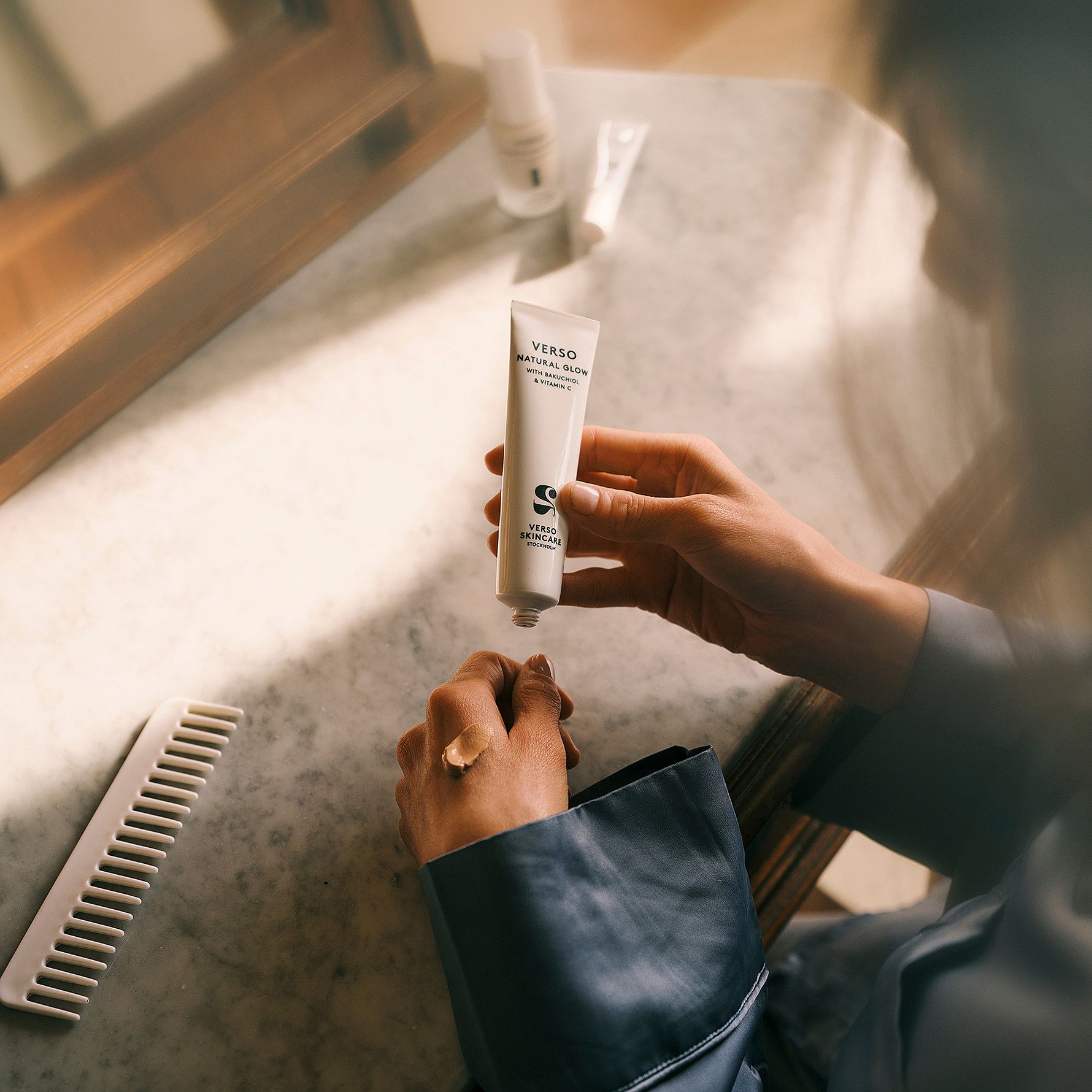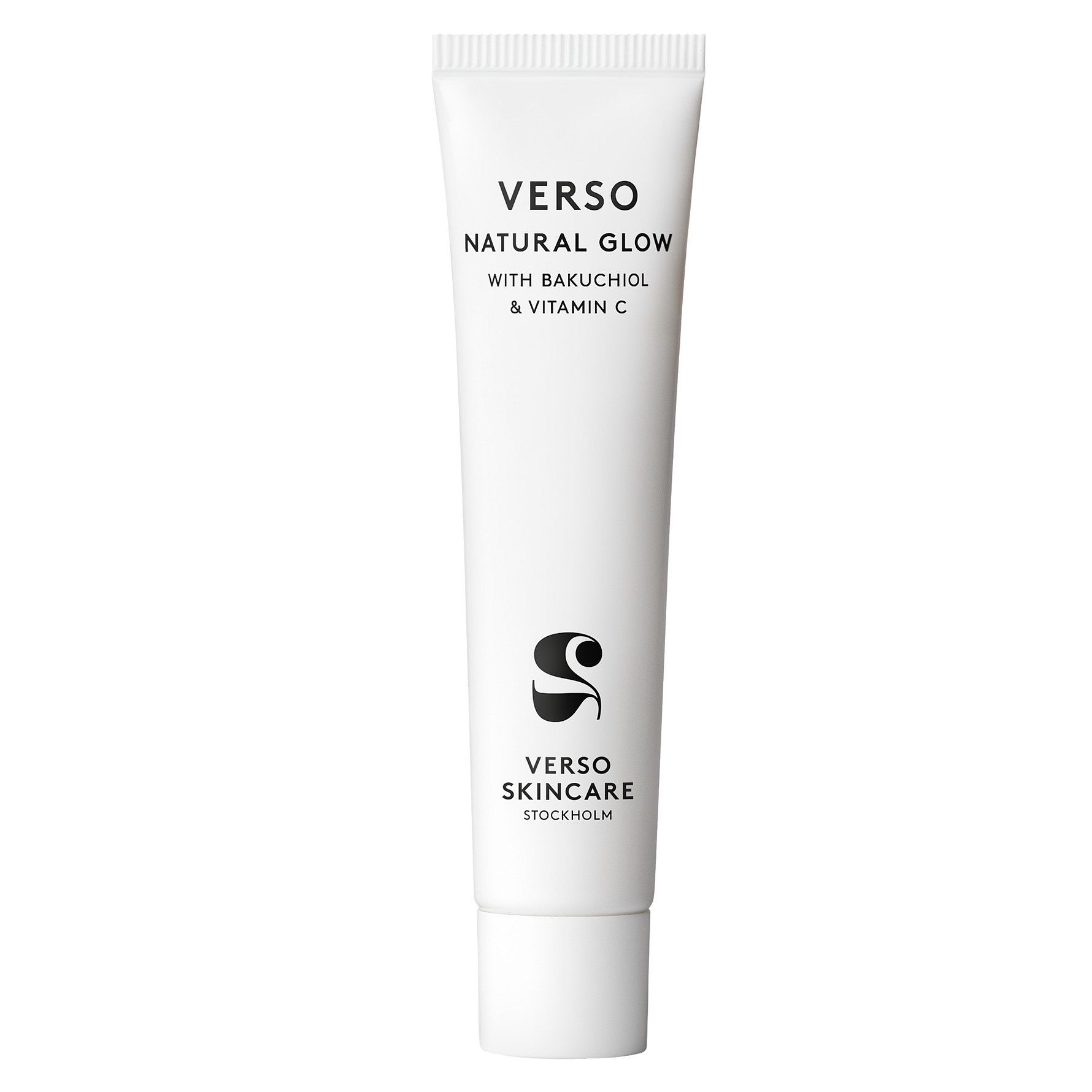 Verso Natural Glow on energisoiva ja hehkua antava päivävoide, joka antaa iholle upeaa hehkua. Bakuchiolia, niasiiniamidia ja C-vitamiinia sisältävä koostumus kosteuttaa, tasoittaa ihon sävyä ja silottaa juonteita sekä auttaa ihoa pysymään raikkaana ja tasapainoisena koko päivän. Bakuchiol on kasviperäinen vaihtoehto retinolille ja vahvistaa ihon luonnollista suojaa yhdessä niasiiniamidin ja C-vitamiinin kanssa. Ainesosat vastustavat ihon ennenaikaista ikääntymistä ja ympäristövaikutuksia. Synteettinen kiille antaa välitöntä hehkua, C-vitamiini auttaa tasoittamaan ihon sävyä ja hoitaa ihoa antioksidanttisten ominaisuuksien ansiosta. Hyaluronihappo antaa iholle näkyvää täyteläisyyttä ja kiinteyttä. Lopputuloksena on hyvinvoiva, kimmoisa ja elinvoimainen iho, jolla on kaunis kullanhehku.