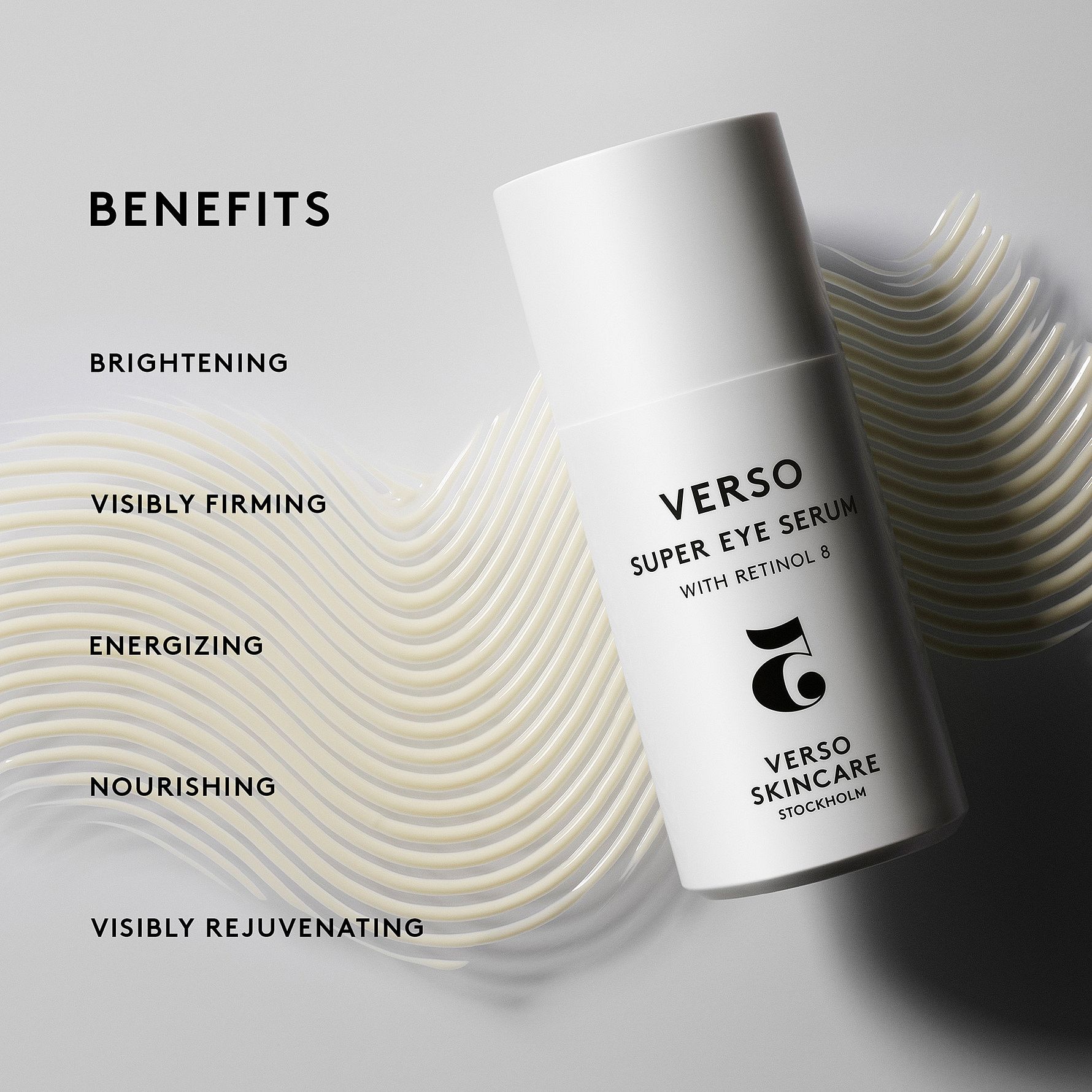 Verso Super Eye Serum on silmänympärysseerumi, joka antaa silottavan ja kiinteyttävän vaikutuksen, vastustaa ikääntymisen merkkejä ja antaa silmänympärysiholle pirteämmän ulkonäön. Ainutlaatuinen koostumus sisältää Retinol 8 -ainesosan ja peptidejä, jotka häivyttävät tummia silmänympäryksiä, turvotusta ja juonteita. Retinol 8 on stabilisoitu A-vitamiiniyhdistelmä, joka on kahdeksan kertaa perinteistä retinolia tehokkaampi (mutta paljon hellävaraisempi). Lisäksi koostumus sisältää kurkumaa, tehokasta antioksidanttia, joka suojaa ihoa ympäristörasitusten, kuten saasteiden ja auringon, negatiivisilta vaikutuksilta. Juonteet ja rypyt silottuvat ja silmänympärysihosta tulee kimmoisampi sekä levänneen ja nuorekkaamman näköinen. Ilmatiiviin pakkauksen ansiosta koostumus säilyy tuoreena, ja kätevä pumppu tekee seerumin annostelusta ja levityksestä helppoa.