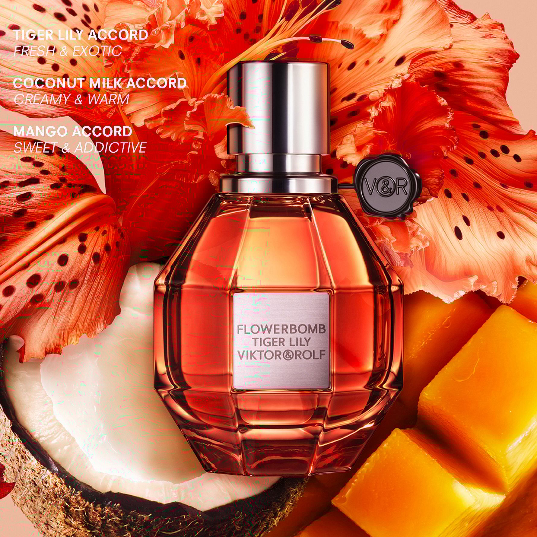 Flowerbomb Tiger Lily on esillä Viktor & Rolfin ikonisen granaatinmuotoisessa pullossa, nyt kauniin meripihkan sävyisenä. Tämä sävy ilmentää tuoksun lämpöä, eloisuutta ja trooppista luonnetta. Jalokivimäinen, monipuolinen muotoilu lisää taiteellisen ja hienostuneen ulottuvuuden jokaiseen hajuvesikokoelmaan.
