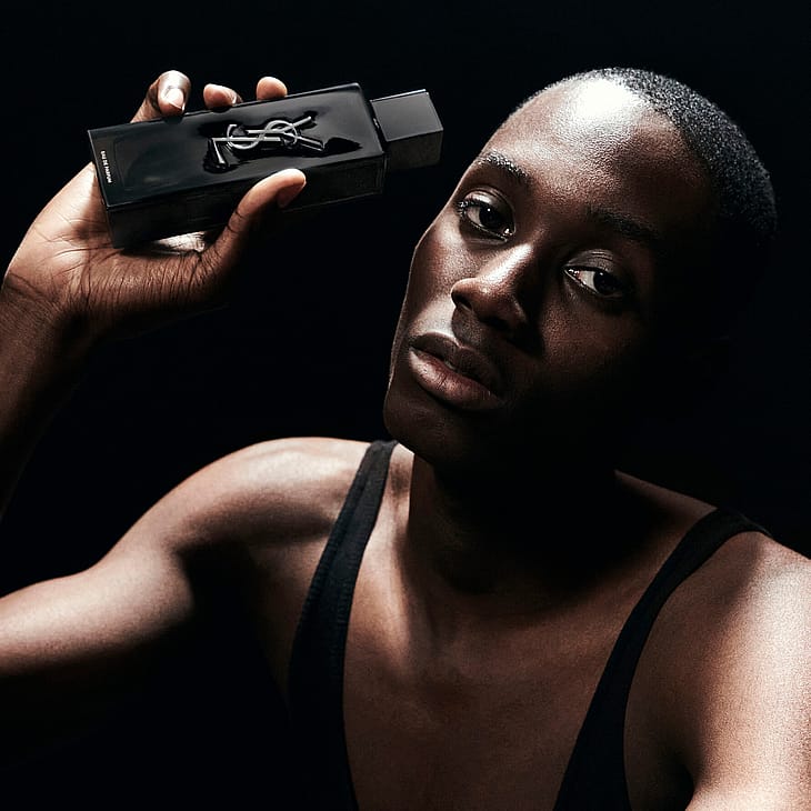 YSL-siluetti pullossa. Hohtava. Soljuva. Mustaksi maalattu monoliitti, josta voit nähdä itsesi. Lasiin upotettu sydän on ikoninen YSL Cassandre -logo.