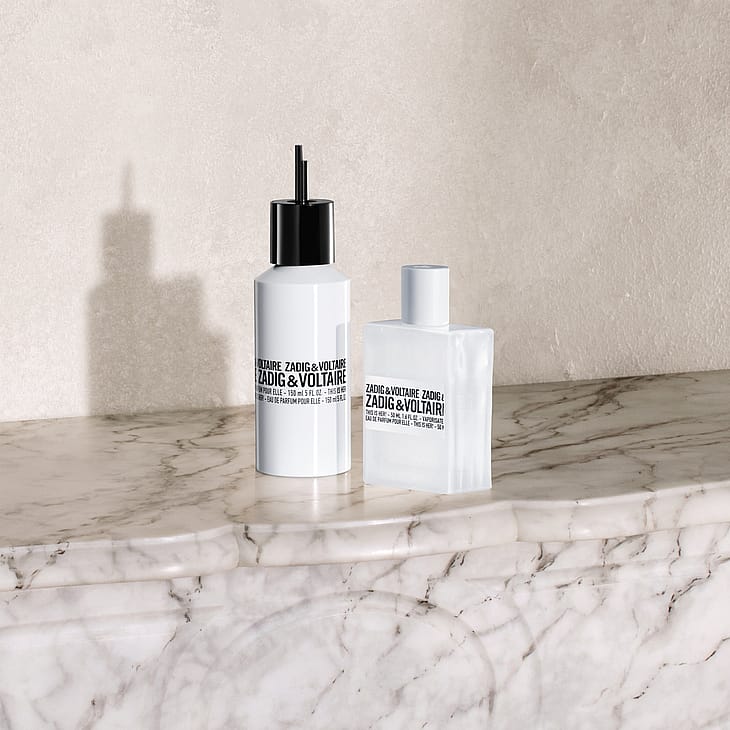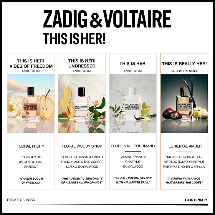 Zadig & Voltaire -tuotemerkki on luokiteltu helpoksi luksukseksi. Heitä kuvaavat sanat ovat rock, taide ja Pariisi. Rock-henkisyys tarkoittaa omana itsenään olemista. Vapautta, oman kapinallisen eleganssin ilmaisua ja itsevarmuutta. This is Her, tämä kaunis vaeltaja levittää kukkaista ja mausteista jasmiinin ja roseepippurin tuoksua. Pehmeä mutta persoonallinen kastanjan ja bentsoiinin sydäntuoksu. Feminiinistä tuoksua vahvistaa sen santelipuupohja.